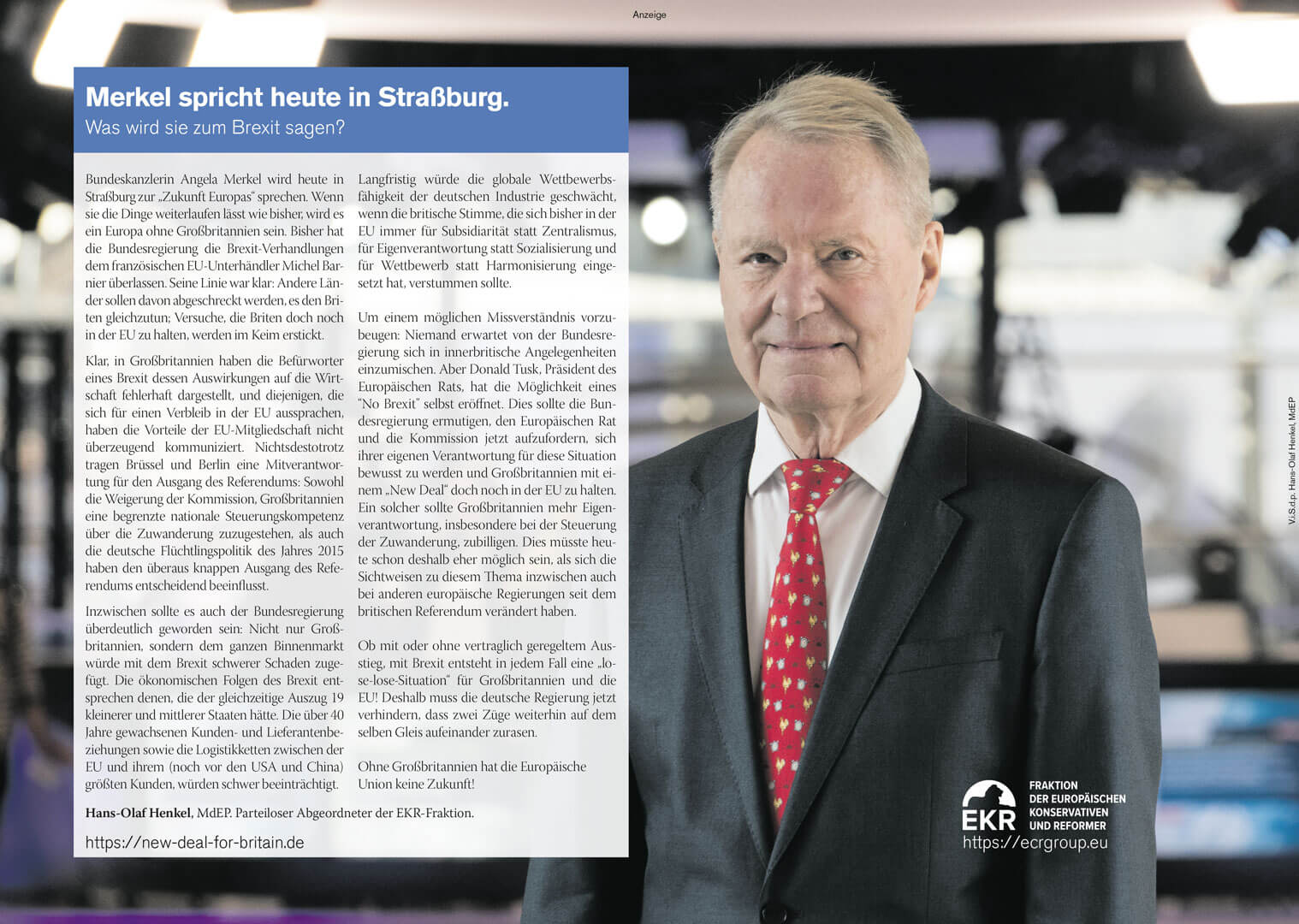 Bundeskanzlerin Angela Merkel wird heute in Straßburg zur „Zukunft Europas“ sprechen. Wenn sie die Dinge weiterlaufen lässt wie bisher, wird es ein Europa ohne Großbritannien sein. Bisher hat die Bundesregierung die Brexit-Verhandlungen dem französischen EU-Unterhändler Michel Barnier überlassen. Seine Linie war klar: Andere Länder sollen davon abgeschreckt werden, es den Briten gleichzutun; Versuche, die Briten doch noch in der EU zu halten, werden im Keim erstickt.